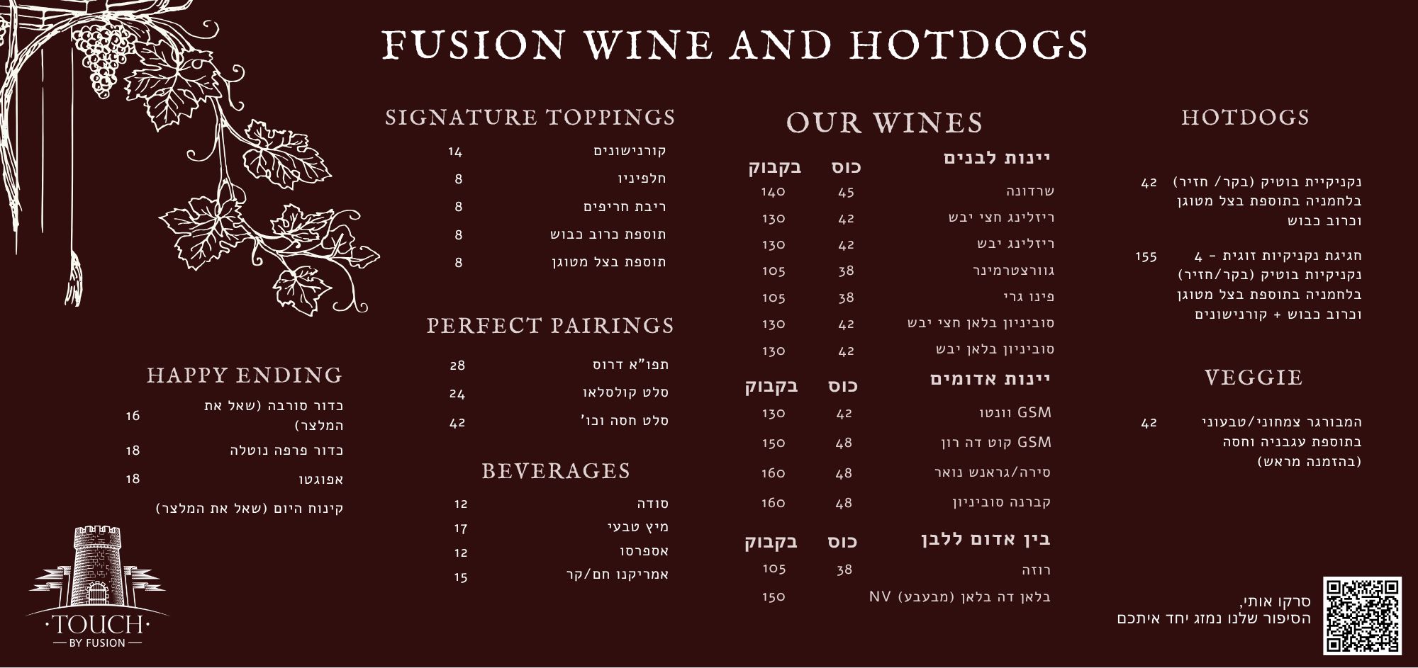 מגוון היינות שלנו, נקניקים, גבינות, פוקאצ’ות או נקניקיות שרקוטרי עם כל התוספות…